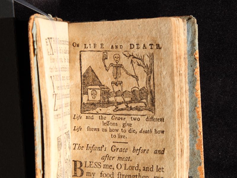 Themes of sin, death, punishment, salvation, and respect for authority were displayed through alphabetic rhymed couplets, poems, prayers, and scriptures. The theme of punishment, for instance, was exhibited in the rhyming couplet for the letter F: “The idle fool / Is whipt at school.” Such themes for a child’s textbook may seem morbid in light of the 18th-century Swiss-born philosopher Jean-Jacques Rousseau’s notions of childhood innocence, but they would not seem so to Puritan families who embraced the doctrine of infant corruption caused by the original sin of Adam.